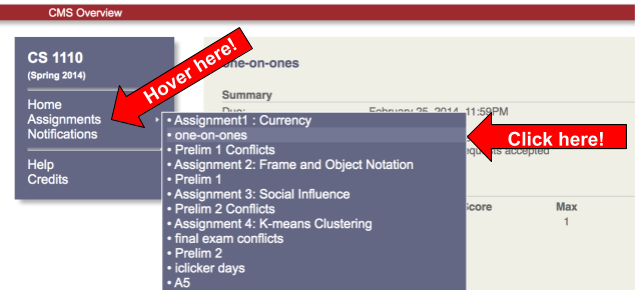 If you are having a problem with using CMS to submit an assignment, and you have attempted the following and taken your necessary screenshots, but still have a CMS issue, contact cs1110-staff before: