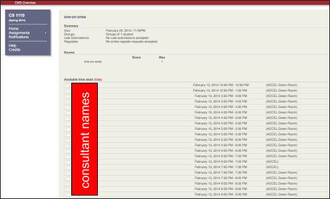 Occasionally, the CS1110 staff will use CMS to offer a large block of one-on-one meeting times for students to meet individually with a staff member. Here are the steps to sign up.