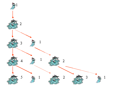 The diagram below illustrates number and age distribution of bacteria at the END of each hour, for the first five hours of the experiment. Note that only the "big" (i.e. mature) bacteria are old enough to reproduce.