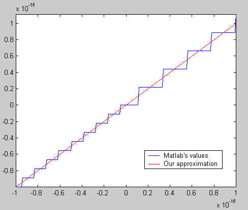 We can avoid the problem described above by avoiding the subtraction between ex and 1. One good way to do this is to use the series given in this problem. If we sum the series without its first term, we expect to get a much better approximation of ex-1. The program below and the graph following it illustrates the dramatic difference in precision between the two approaches.