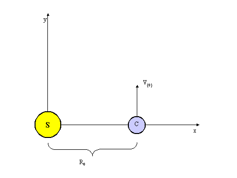 Setup: In this problem we will simulate and study the behavior of celestial objects under the influence of gravitation. Let us consider a massive star (S) in the origin of a system of coordinates XY. A small comet C can be found at position x0 = R0, y0 = 0, and has currently a speed of v0 parallel to axis y and oriented toward its positive direction. The diagram below illustrates the just described initial conditions: