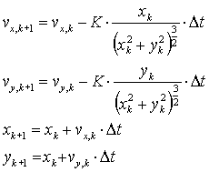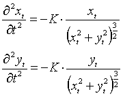 If we know the position (xt, yt) of the comet at moment t, we can describe the comet's movement by using differential equations. It is best if we separate the movements along the two axes, and we study them separately. We get the following two equations: