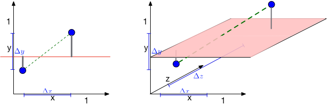 So the distance between two randomly drawn data points increases drastically with their dimensionality. How about the distance to a hyperplane? Consider the following figure. There are two blue points and a red hyperplane. The left plot shows the scenario in 2d and the right plot in 3d. As long as \(d=2\), the distance between the two points is \(\sqrt{{\Delta x}^2+{\Delta y}^2}\). When a third dimension is added, this extends to \(\sqrt{{\Delta x}^2+{\Delta y}^2+\Delta z^2}\), which must be at least as large (and is probably larger). This confirms again that pairwise distances grow in high dimensions. On the other hand, the distance to the red hyperplane remains unchanged as the third dimension is added. The reason is that the normal of the hyper-plane is orthogonal to the new dimension. This is a crucial observation. In \(d\) dimensions, \(d-1\) dimensions will be orthogonal to the normal of any given hyper-plane. Movement in those dimensions cannot increase or decrease the distance to the hyperplane --- the points just shift around and remain at the same distance. As distances between pairwise points become very large in high dimensional spaces, distances to hyperplanes become comparatively tiny. For machine learning algorithms, this is highly relevant. As we will see later on, many classifiers (e.g. the Perceptron or SVMs) place hyper planes between concentrations of different classes. One consequence of the curse of dimensionality is that most data points tend to be very close to these hyperplanes and it is often possible to perturb input slightly (and often imperceptibly) in order to change a classification outcome. This practice has recently become known as the creation of adversarial samples, whose existents is often falsely attributed to the complexity of neural networks.
