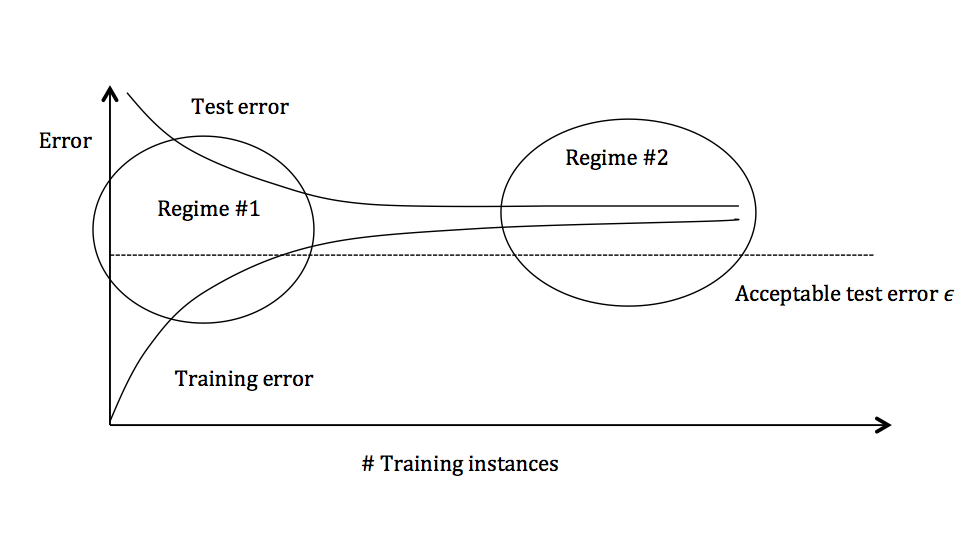 The graph above plots the training error and the test error and can be divided into two overarching regimes. In the first regime (on the left side of the graph), training error is below the desired error threshold (denoted by \(\epsilon\)), but test error is significantly higher. In the second regime (on the right side of the graph), test error is remarkably close to training error, but both are above the desired tolerance of \(\epsilon\).![]()