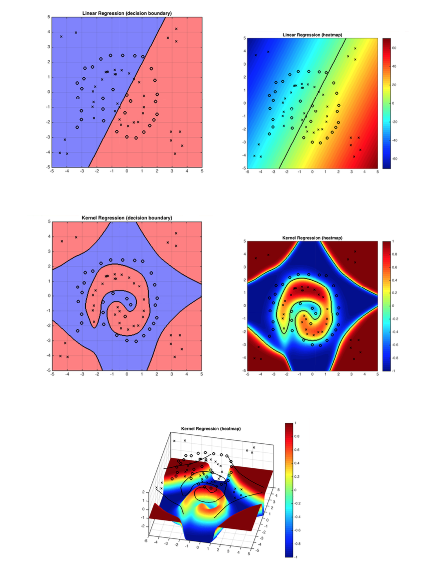 Figure 1: The demo shows how kernel function solves the problem linear classifiers can not solve. RBF works well with the decision boundary in this case.