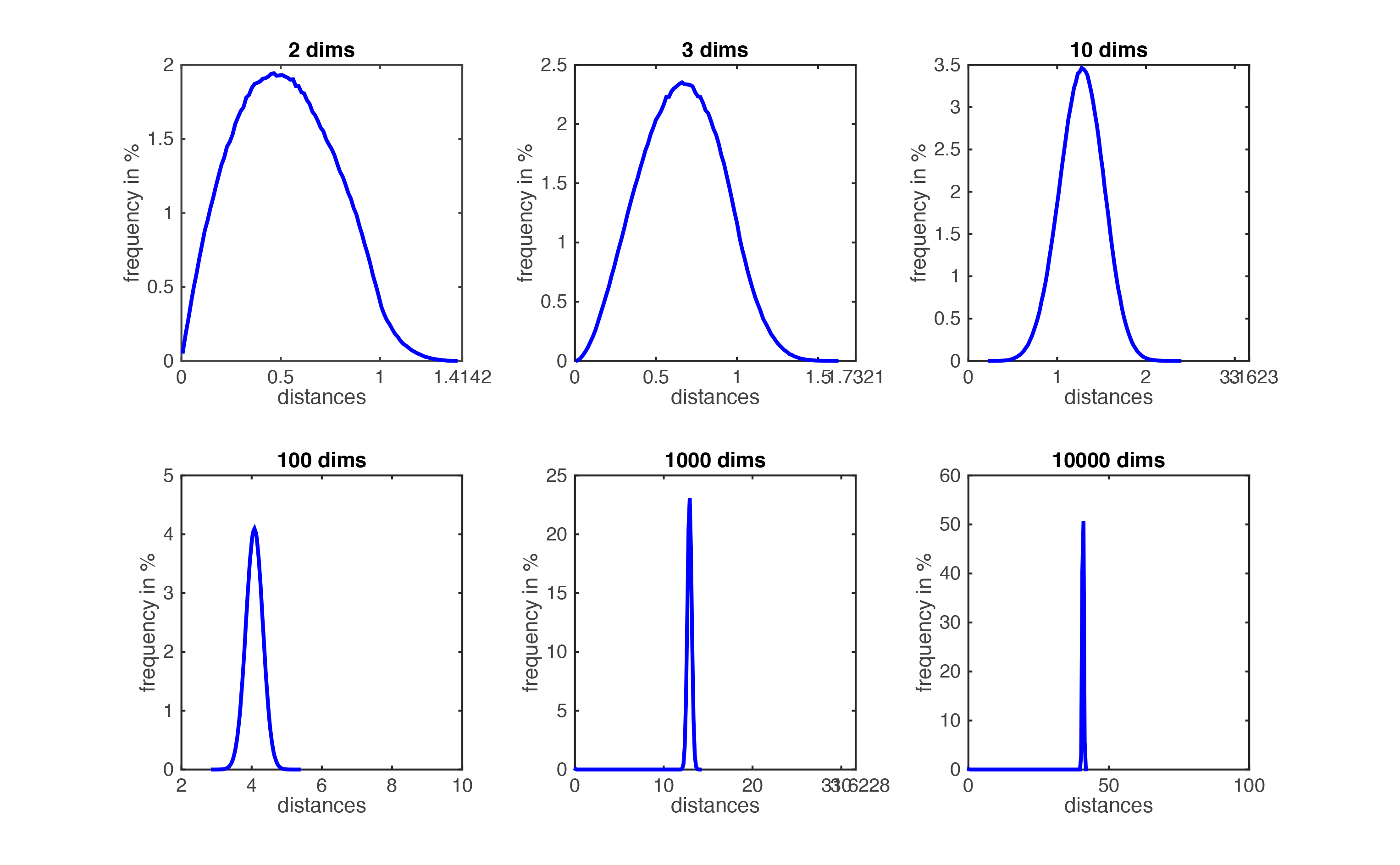 Figure demonstrating ``the curse of dimensionality''. The histogram plots show the distributions of all pairwise distances between randomly distributed points within \(d\)-dimensional unit squares. As the number of dimensions \(d\) grows, all distances concentrate within a very small range.