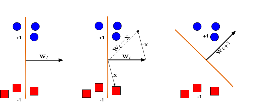 Illustration of a Perceptron update. (Left:) The hyperplane defined by \(\mathbf{w}_t\) misclassifies one red (-1) and one blue (+1) point. (Middle:) The red point \(\mathbf{x}\) is chosen and used for an update. Because its label is -1 we need to subtract \(\mathbf{x}\) from \(\mathbf{w}_t\). (Right:) The udpated hyperplane \(\mathbf{w}_{t+1}=\mathbf{w}_t-\mathbf{x}\) separates the two classes and the Perceptron algorithm has converged.