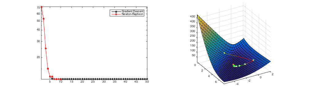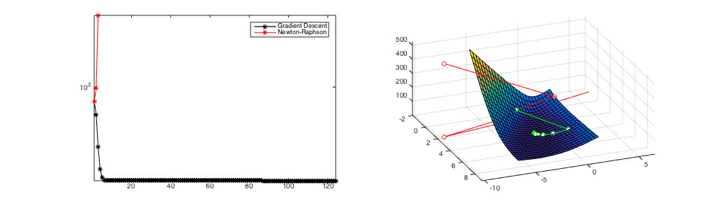 The three plots show a comparison of Newton's Method and Gradient Descent. Gradient Descent always converges after over 100 iterations from all initial starting points. If it converges (Figure 1), Newton's Method is much faster (convergence after 8 iterations) but it can diverge (Figure 2). Figure 3 shows the hybrid approach of taking 6 gradient descent steps and then switching to Newton's Method. It still converges in only 10 updates.