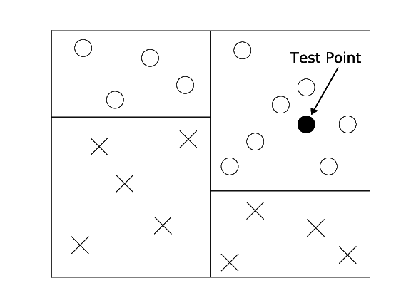 Decision trees are exploiting exactly that. Here, we do not store the training data, instead we use the training data to build a tree structure that recursively divides the space into regions with similar labels. The root node of the tree represents the entire data set. This set is then split roughly in half along one dimension by a simple threshold \(t\). All points that have a feature value \(\geq t\) fall into the right child node, all the others into the left child node. The threshold \(t\) and the dimension are chosen so that the resulting child nodes are purer in terms of class membership. Ideally all positive points fall into one child node and all negative points in the other. If this is the case, the tree is done. If not, the leaf nodes are again split until eventually all leaves are pure (i.e. all its data points contain the same label) or cannot be split any further (in the rare case with two identical points of different labels).