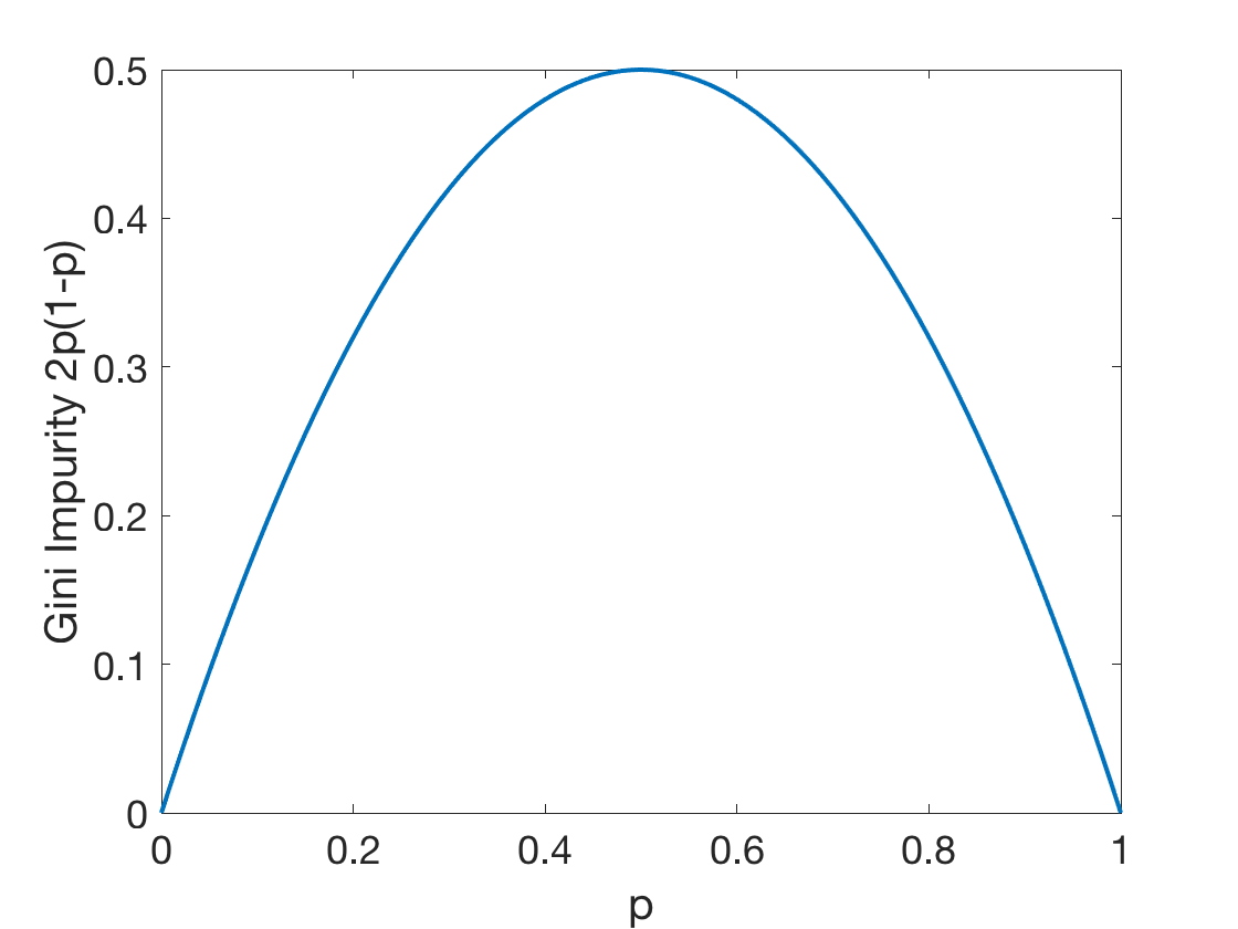 Fig: The Gini Impurity Function in the binary case reaches its maximum at \(p=0.5\).