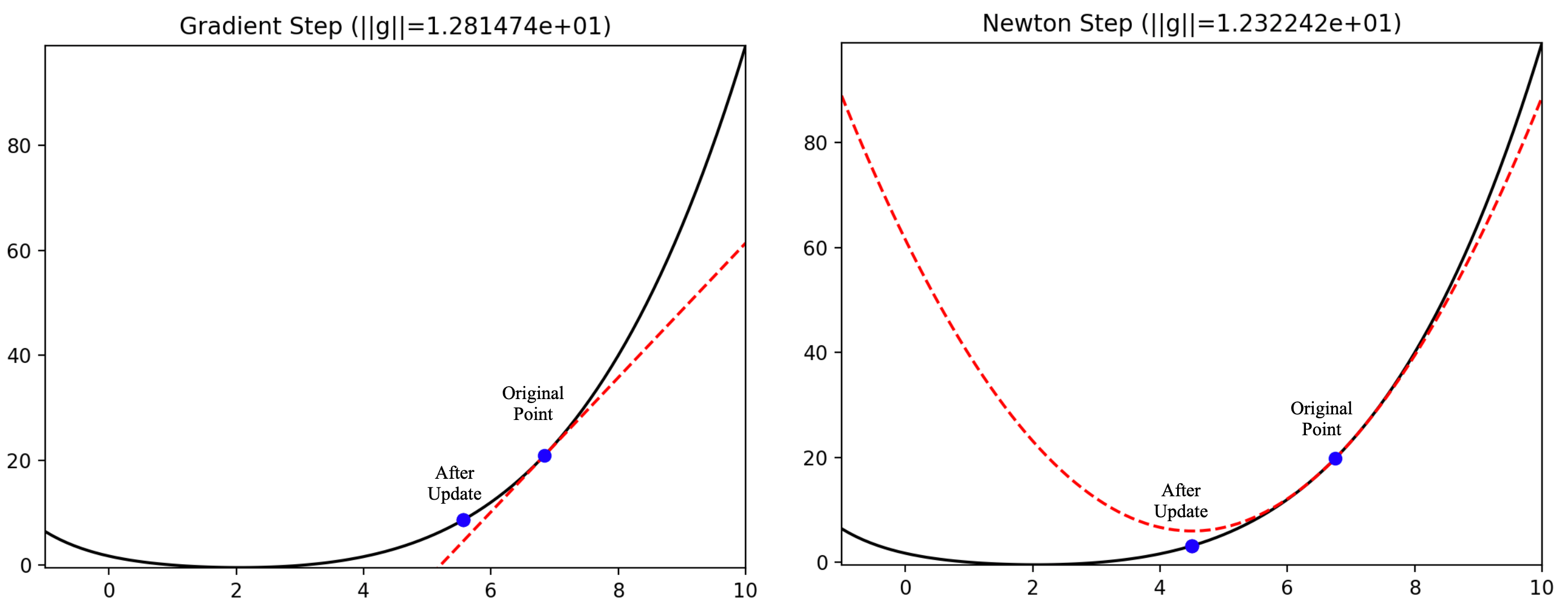 A gradient descent step (left) and a Newton step (right) on the same function. The loss function is depicted in black, the approximation as a dotted red line. The gradient step moves the point downwards along the linear approximation of the function. The Newton step moves the point to the minimum of the parabola, which is used to approximate the function.