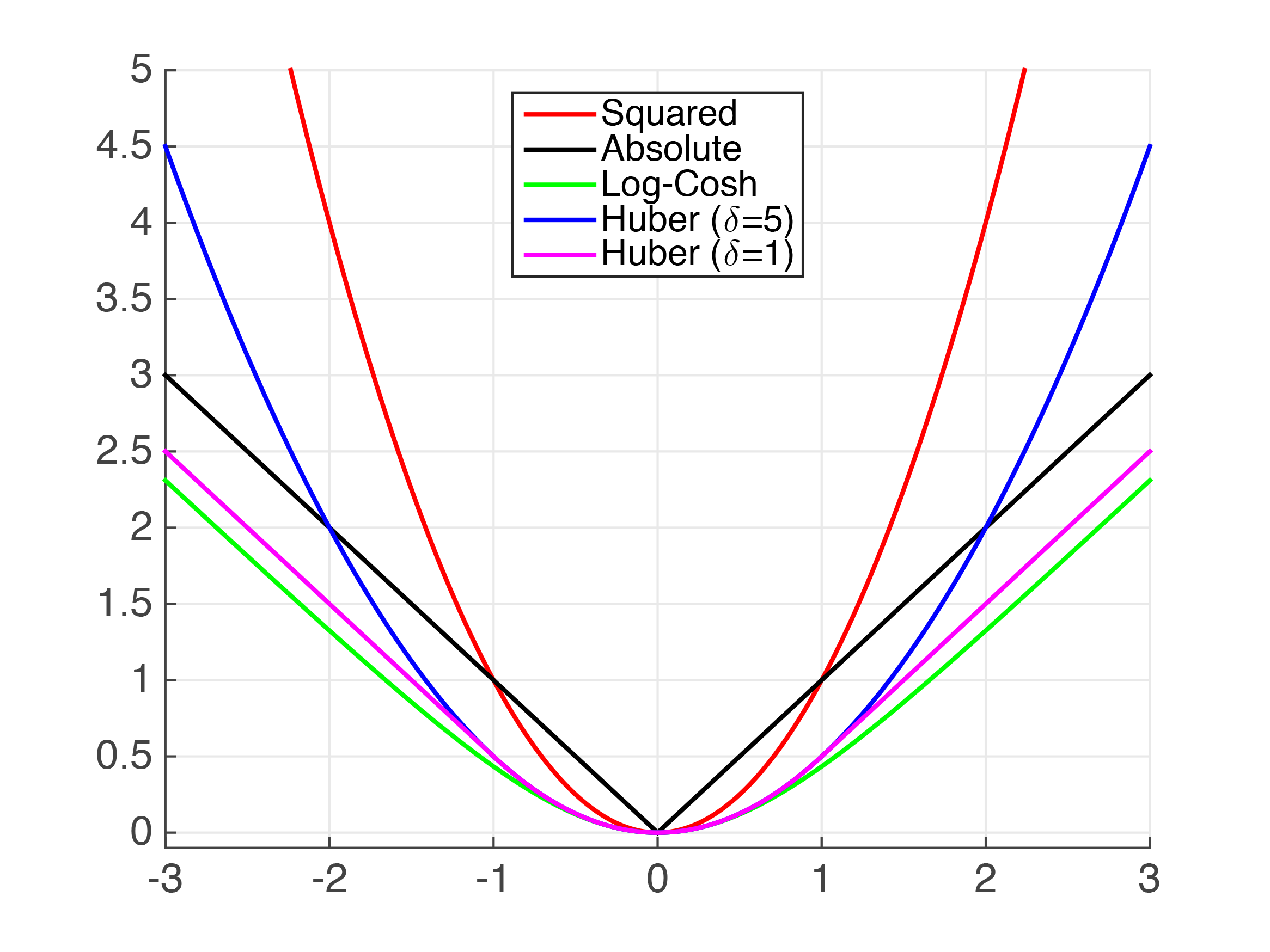 Log-Cosh Loss \(\left.log(cosh(h(\mathbf{x}_{i})-y_{i}))\right.\), \(\left.cosh(x)=\frac{e^{x}+e^{-x}}{2}\right.\) |