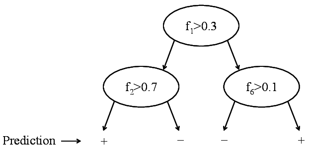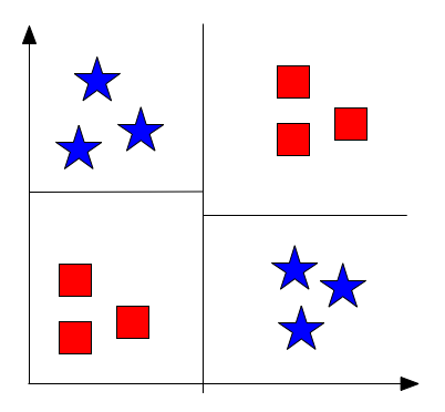 Decision trees are exploiting exactly that. Here, we do not store the training data, instead we use the training data to build a tree structure that recursively divides the space into regions with similar labels. The root node of the tree represents the entire data set. This set is then split roughly in half along one dimension by a simple threshold \(t\). All points that have a feature value \(\geq t\) fall into the right child node, all the others into the left child node. The threshold \(t\) and the dimension are chosen so that the resulting child nodes are purer in terms of class membership. Ideally all positive points fall into one child node and all negative points in the other. If this is the case, the tree is done. If not, the leaf nodes are again split until eventually all leaves are pure (i.e. all its data points contain the same label) or cannot be split any further (in the rare case with two identical points of different labels).