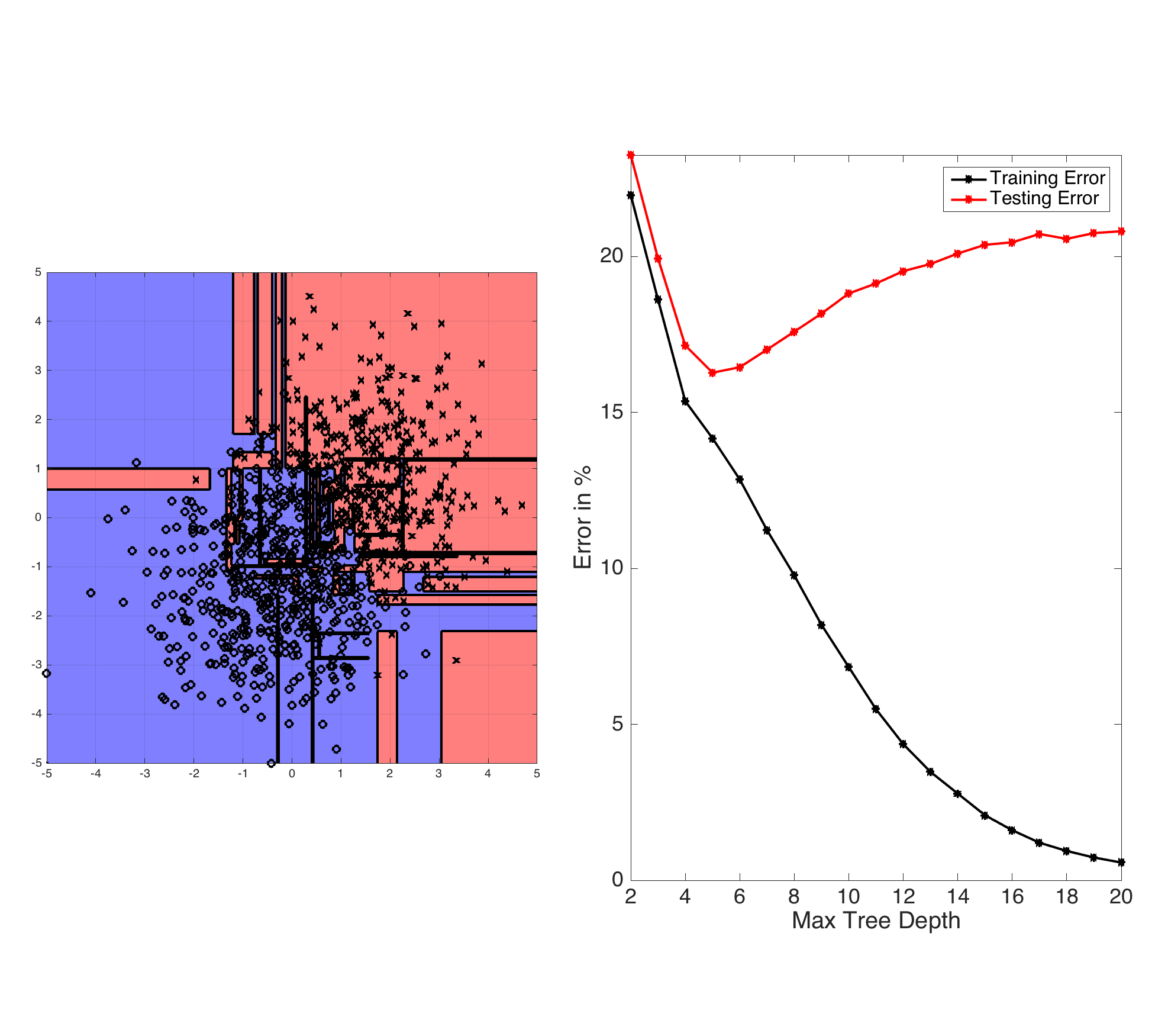 Fig: ID3-trees are prone to overfitting as the tree depth increases. The left plot shows the learned decision boundary of a binary data set drawn from two Gaussian distributions. The right plot shows the testing and training errors with increasing tree depth.